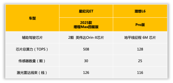 理想 L6 Pro 则搭载地平线征程6M芯片,算力为128TOPS,虽标配ATL激光雷达,但传感器总数仅25颗,且800万像素摄像头仅2颗,相比之下,理想L6 Pro版在智能驾驶硬件配置上相对保守。