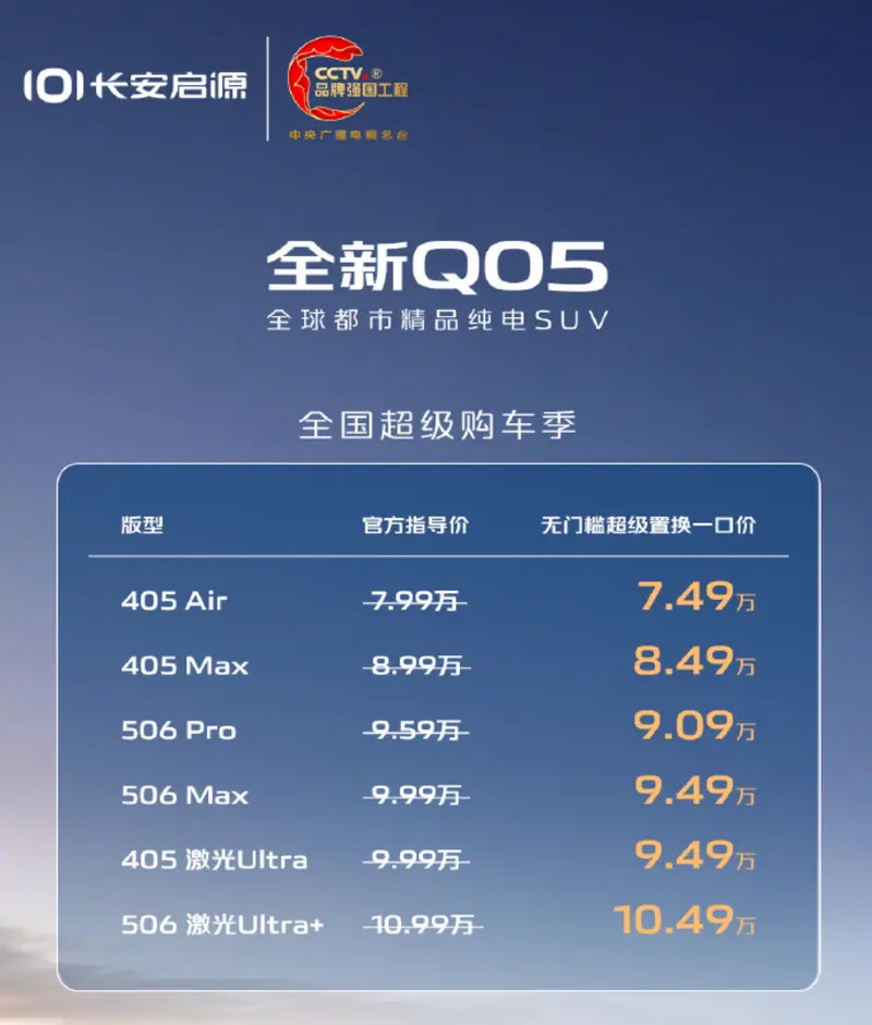 天天电动获悉,近日长安启源发布Q05 新车的购车权益,即刻下订享无门槛超级置换补贴5000元,新车无门槛超级置换一口价7.49-10.49万元。