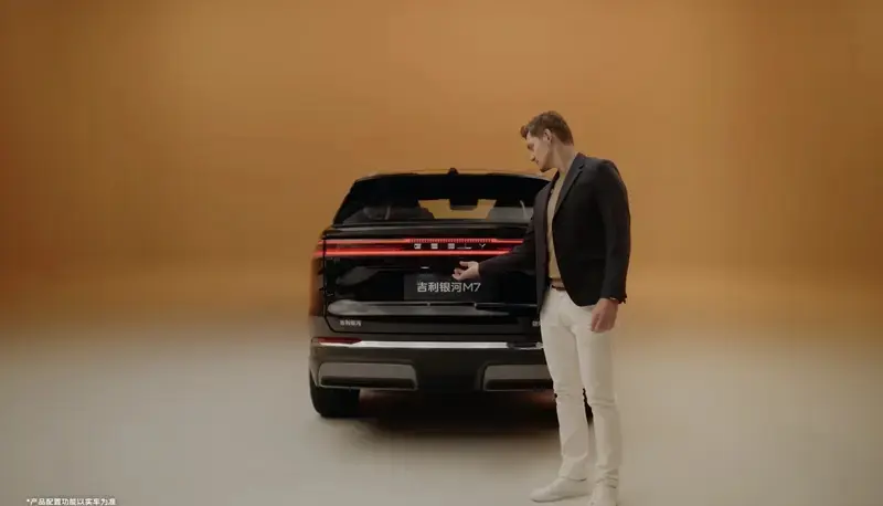 外观造型上,银河 M7 采用吉利银河最新 “飞檐虎视” 家族设计语言,前脸最具辨识度的 “星汉涟漪” 贯穿灯组跨度超两米,内含 362 颗 LED 光源与 500 个激光镭雕细节,搭配两侧镀铬装饰的导流槽,让科技感与精致感兼具。