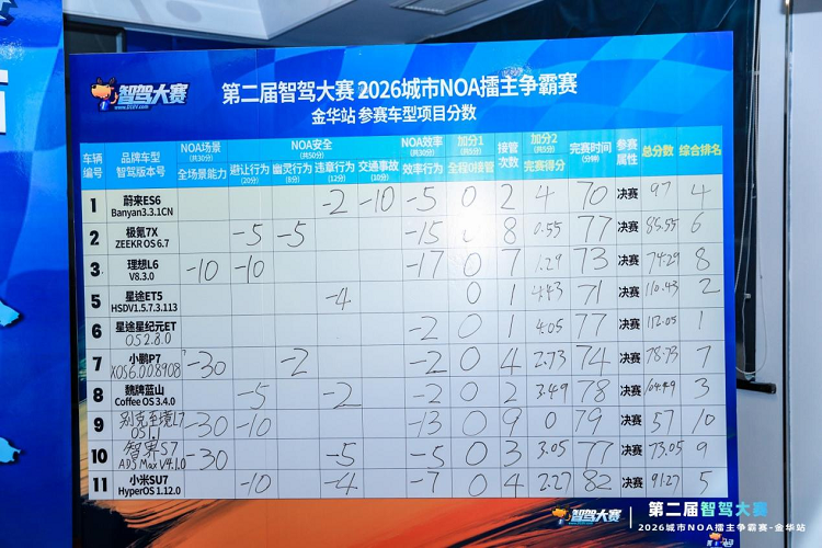 但即使在如此复杂的路况环境之中,ET、ES也依然表现出色,两款车分别耗时77、71分钟完成比赛,凭借着在全场景能力、避让行为、幽灵行为、违章行为、交通事故、效率行为等多个维度全面领先于其他参赛选手的高分,分别取得112.05、110.43的总分,而本次参赛车型,得分最低的仅有57分,大部分车型的平均得分,也仅在70-90分左右。