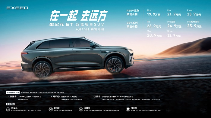 4月15日,“在一起,去远方”星纪元之夜暨星纪元ET预售发布会在北京隆重举行。本次星纪元ET共提供纯电版与增程版两种,分别是REEV系列:Plus 19.9万元、Pro 21.9万元、Pro+ 23.9万元,以及BEV系列:Pro 23.9万元、Pro四驱 24.9万元、Pro城市智驾 25.9万元、Max 28.9万元、Ultra 32.9万元。