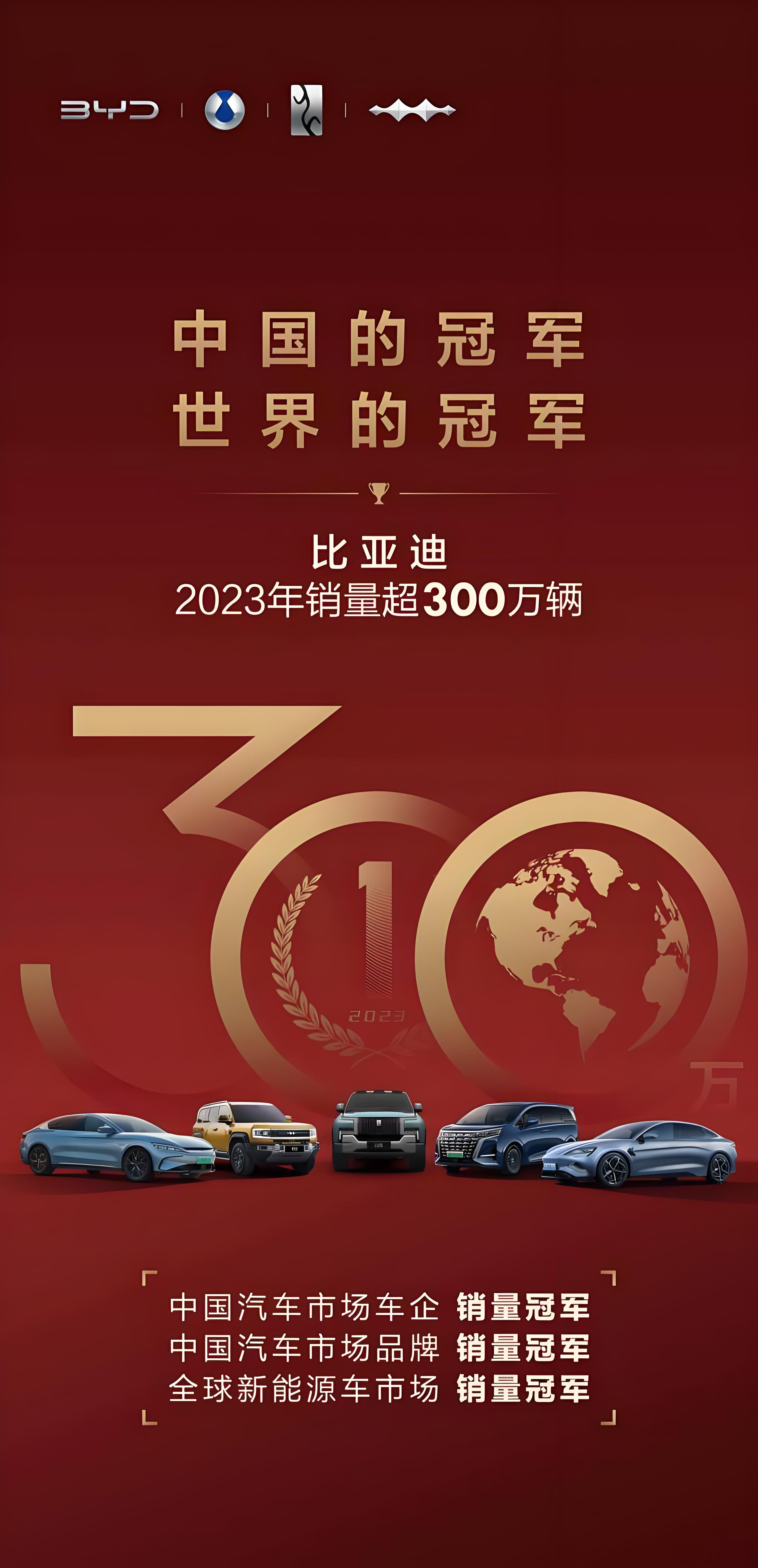 相关数据显示,比亚迪在2023年的销量达到了3,024,417辆,同比增长61.86%,完成了年销量300万辆的目标。其中,比亚迪王朝/海洋网12月累计销售321,570辆,同比增长40.7%。腾势汽车12月累计销售11,929辆,同比增长98.8%。仰望汽车品牌12月累计销售1,593辆,环比增长290.4%。方程豹汽车方面,12月累计销售5,086辆,环比增长712.5%。