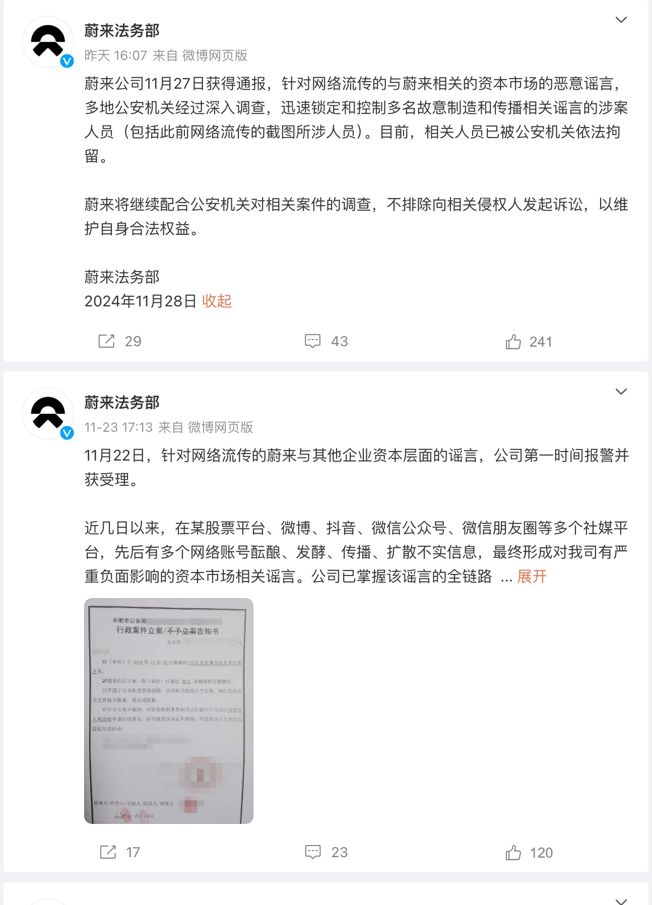 11月28日,蔚来法务部官方账号发布消息,蔚来公司11月27日获得通报,针对网络流传的与蔚来相关的资本市场的恶意谣言,多地公安机关经过深入调查,迅速锁定和控制多名故意制造和传播相关谣言的涉案人员(包括此前网络流传的截图所涉人员)。
