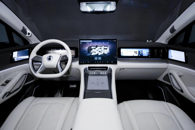 内饰部分,腾势N9科技感十足,前排配备三块大屏幕,包括17.3英寸中控屏、13.2英寸全液晶仪表和13.2英寸副驾娱乐屏,科技感十足。座椅布局采用2+2+2的六座设计,并配备后排液晶屏和小桌板。后排还配备了专属冰箱,进一步提升了豪华感。