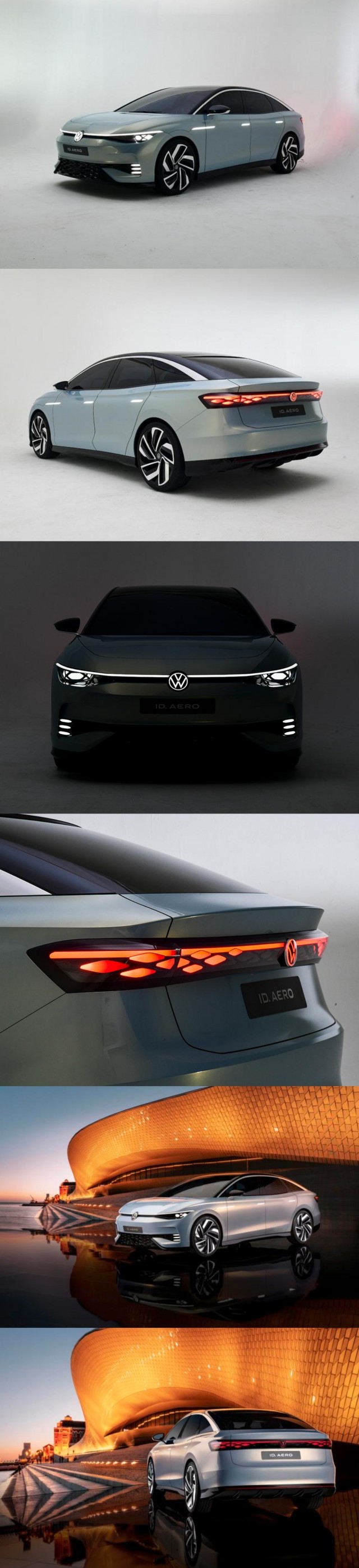 首先看一下大众ID. AERO的外观表现,新车同样基于了大众的MEB平台打造,定位中大型纯电动轿车,这与大师兄ID.3\ID.4\ID.5师出同门。所以在外观造型方面,大众ID. AERO也延续了家族式设计风格。前脸矩阵式大灯,中间贯穿环绕LED等待,发光LOGO镶嵌居中。封闭式前脸下方设计有蜂窝状的进气口,相比此前ID车型大众ID. AERO车头整体给人感觉更加简约。
