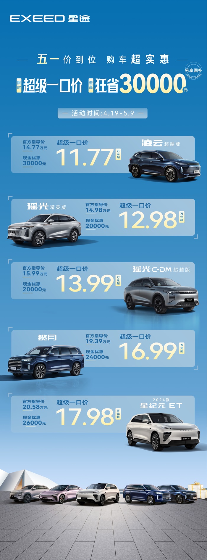 随着五一假期的临近,汽车市场的促销热潮也提前拉开帷幕。作为中国品牌高端化的代表之一,星途诚意满满,4月19日起至5月9日,星途汽车多款重磅车型开启促销模式,其中凌云超越版推出限时超级一口价活动,现金优惠30000元,一口价仅需11.77万元,更可额外享受国补优惠。这一超值价格不仅让凌云超越版在同级市场中性价比优势凸显,更以四大越级价值标杆,为消费者带来远超期待的用车体验。如果你正打算选购一款兼具性能、安全、舒适与智能的高品质SUV,那么这次难得的购车良机不容错过。
