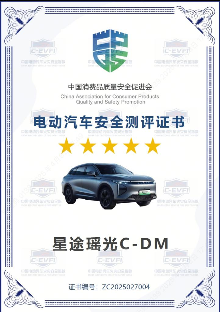 星途瑶光C-DM寰球版所搭载的电池以烈焰灼烧70秒依然不起火不爆炸的实力表现出良好的高温耐受性能与安全稳定性。此前,瑶光C-DM还曾历经“过刀山”底盘刮底试验、“超国标126倍”电池跌落撞击小截面障碍物测试,做到“不漏液,不冒烟、不起火”。而在人工制造800摄氏度高温引发电芯熔融的相关实验中,瑶光C-DM做到以强大热管理与优异的电池燃设计,避免热失控蔓延,斩获火灾安全五星评级。