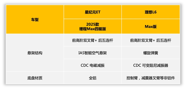 再看理想L6 Max版,其底盘同样采用了前双叉臂、后五连杆的悬架形式,这在结构基础上保证了不错的舒适性。然而,它在悬架核心配置上做出了取舍,并未配备更高级的空气悬架,仅提供了螺旋弹簧与CDC可变阻尼减振器的组合。这意味着它无法实现悬架高低的主动调节,在面对连续起伏或非铺装路面时,应对能力相对固化。此外,理想L6的底盘材质也并非全铝,其控制臂、减震器叉臂等部件仍使用传统钢制或非铝件,簧下质量相对更高,这对操控灵敏性与细微振动过滤存在一定影响。相比之下,星纪元ET的全铝底盘不仅有效降低了25%的簧下质量,提升了悬挂响应速度,还通过HDS液压减震系统将隔振率提升了25%,为操控稳定性和乘坐舒适性奠定了更坚实的物理基础。