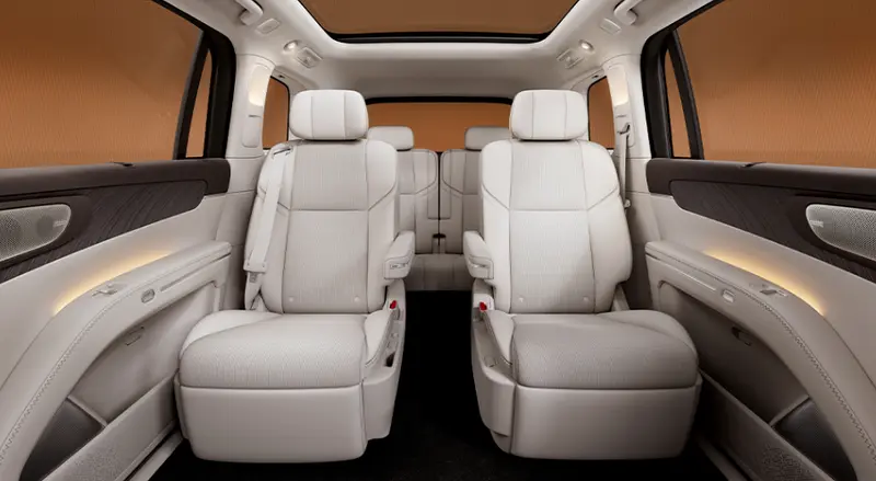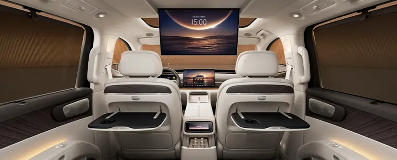 从官方发布的零跑D19 内饰图看,新车中控采用了环抱式设计,配备了悬浮式大屏,隐藏式空调出风口,HUD抬头显示,手机无线充电面板,对开式扶手箱。来到第二排,我们可以看到新车配备了小桌板,头顶娱乐屏,冰箱以及功能控制屏。此外,新车还设置了B柱拉手,方便儿童、老人下车。二排座椅配备了独立扶手、腿托等。