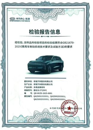 恰好,当前奇瑞汽车已经通过中汽研EMB系统GB21670-2025EMB系统测试,并拿下了0001号测试合格证书,为品牌产品规划了清晰的高端技术路径。
