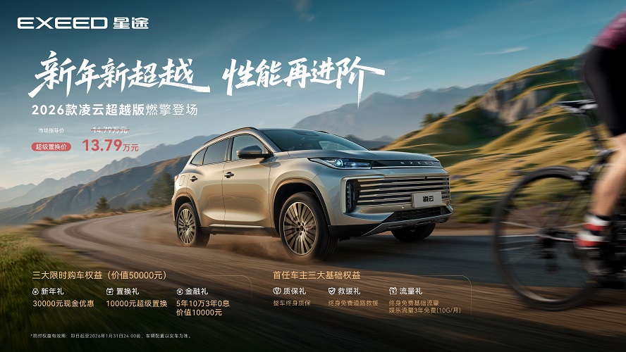 新年启新程,超越再进阶。星途品牌正式启动“新年新超越,人生再进阶”主题活动,旗下旗舰SUV 2026款揽月超越版 与性能标杆 2026款凌云超越版 同步上市。揽月超越版官方指导价为18.79万元,限时超级置换价为17.79万元;凌云超越版官方指导价为14.79万元,限时超级置换价为13.79万元。