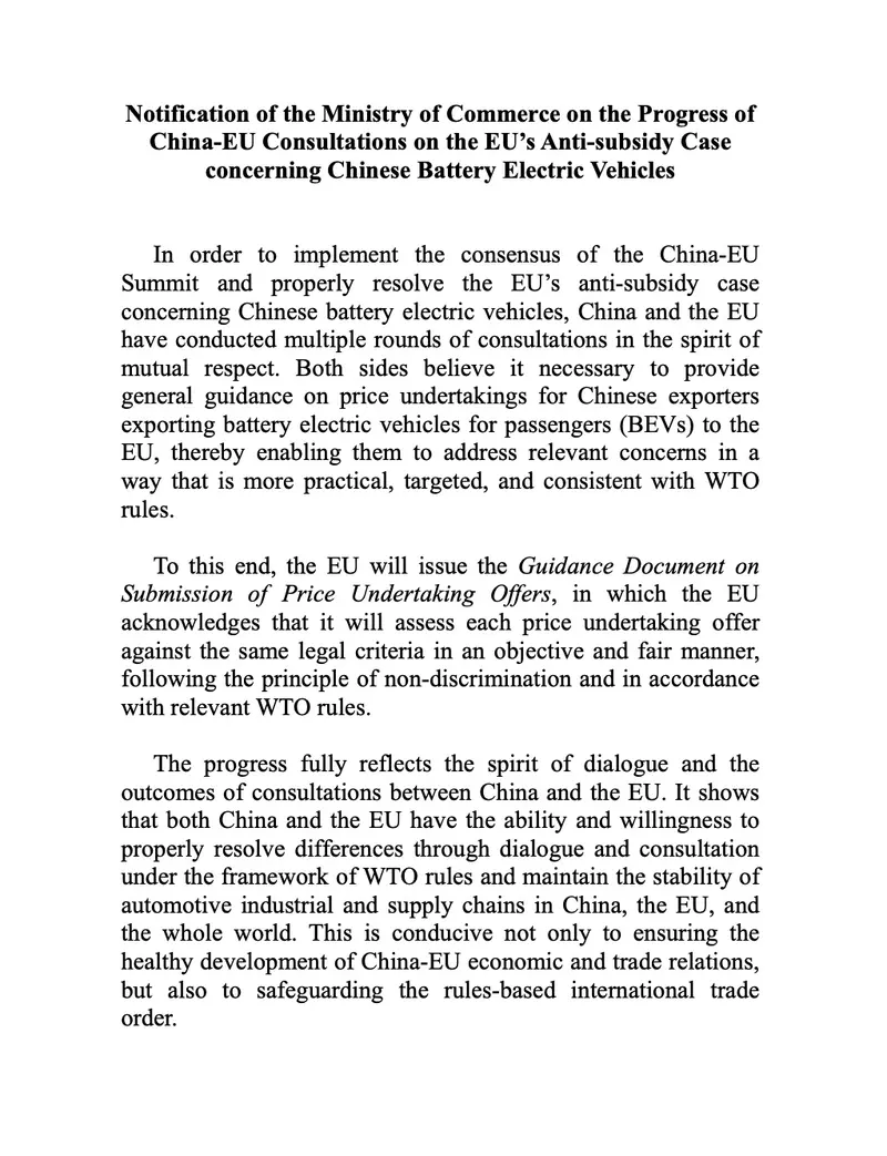 日前,据中国商务部最新通报,双方在相互尊重、平等对话的基础上,就如何通过符合世界贸易组织(WTO)规则的方式化解分歧达成重要共识。双方一致认为,有必要向对欧出口纯电动汽车的中国企业提供关于“价格承诺”机制的明确指引,以推动问题在多边贸易框架内得到务实、有效的解决。