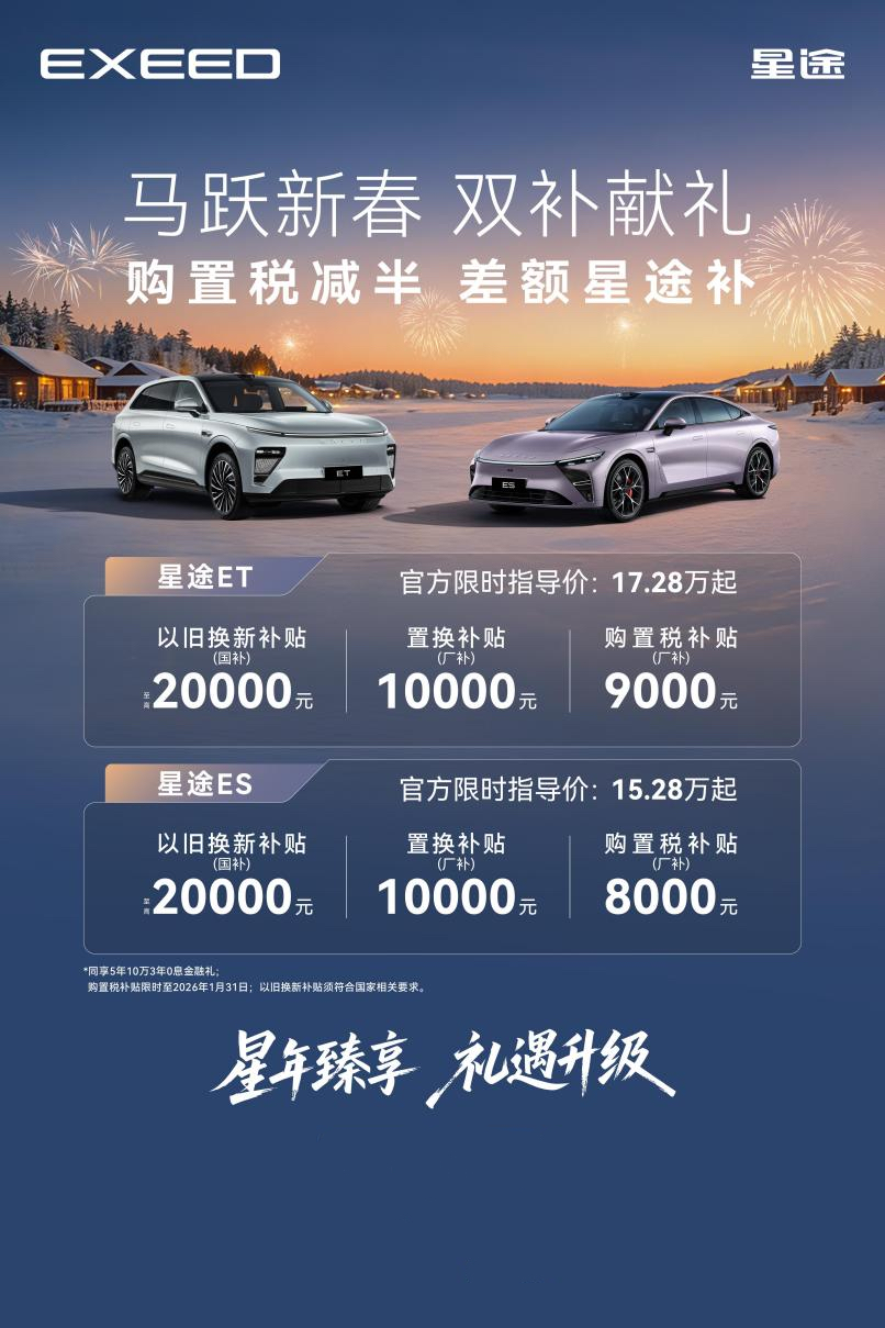 马跃新春,开启新境。春节将至,无论是为了未来长久的舒适与陪伴,还是眼前这份阖家团圆的温暖时刻,选择一辆合适的座驾,都显得格外重要。在2026年,随着“星途3.0时代”开局,星途汽车正式开启一场与用户的“双向奔赴”,全系车型重磅集结,诚献超值购车礼遇,其中ET、ES两款“宝藏车型”不仅带来置换补贴、现金优惠、金融减免等多重诚意政策,更凭借出色性能与配置为用户创造更从容的优质出行体验。