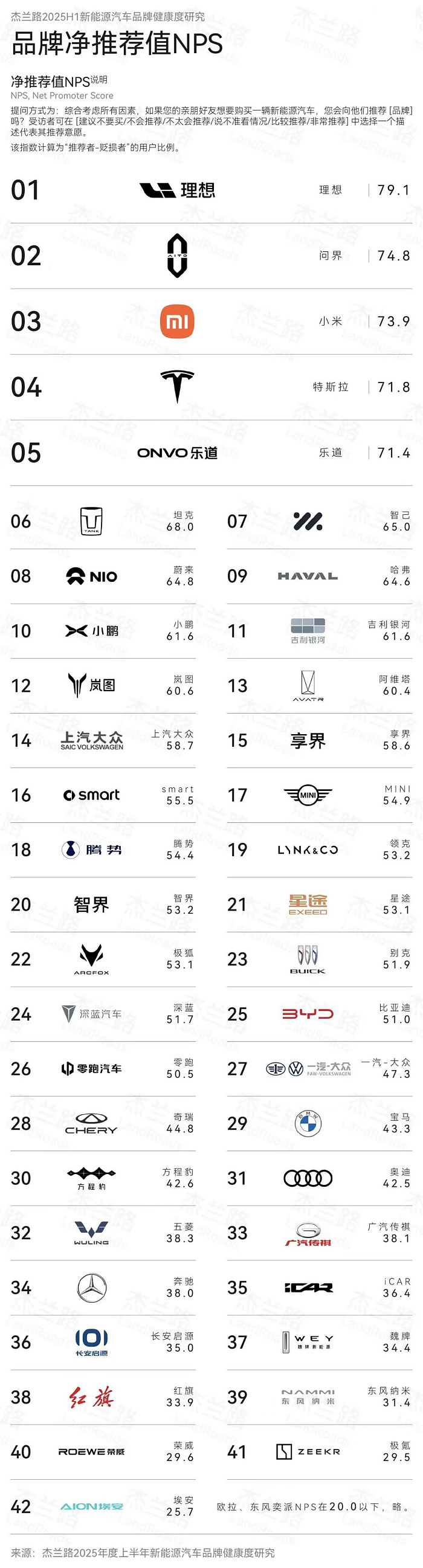 7月8日,杰兰路公司发布2025年度上半年新能源汽车品牌健康度研究 (NPS篇),对中国汽车行业44个新能源汽车品牌进行调查研究,这个排名可能大家觉得很意外,但是我们从目前新能源产品的市场走向来看,这个排名和新能源汽车的销量,正好形成非常好的契合,所以,值得关注。