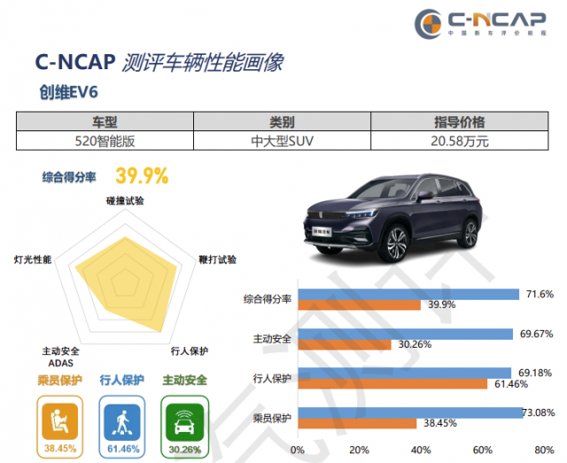 在C-NCAP的测试中,车辆的乘员保护、行人保护、主动安全分别占比的权重为60%、15%、25%,而创维EV6 520智能版车型在这三项中得分率权重分别为23.07%、9.22%、7.57%。