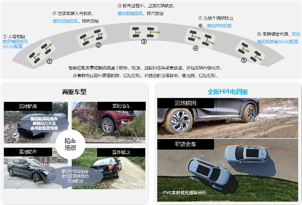 而比如在坡道起步、低附路面和急加速场景下,全新Hi4的智能扭矩矢量控制系统(iTVC),可利用前后轴双电机驱动,调节前后轴的扭矩输出,将打滑轴的扭矩分配至非打滑轴,充分利用前后轮的附着力,并在必要时介入制动力控制,增加非打滑轮的扭矩输出,兼顾安全、车辆加速动力、低附着行驶性能的同时,减少打滑现象的发生,并能提升车辆加速及爬坡性能。