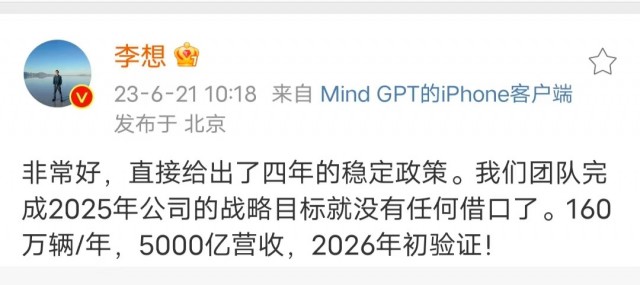 对于这一政策理想汽车李想直接表示:“非常好,直接给出了四年的稳定政策。我们团队完成2025年公司的战略目标就没有任何借口了。160 万辆/年,5000亿营收,2026年初验证!“